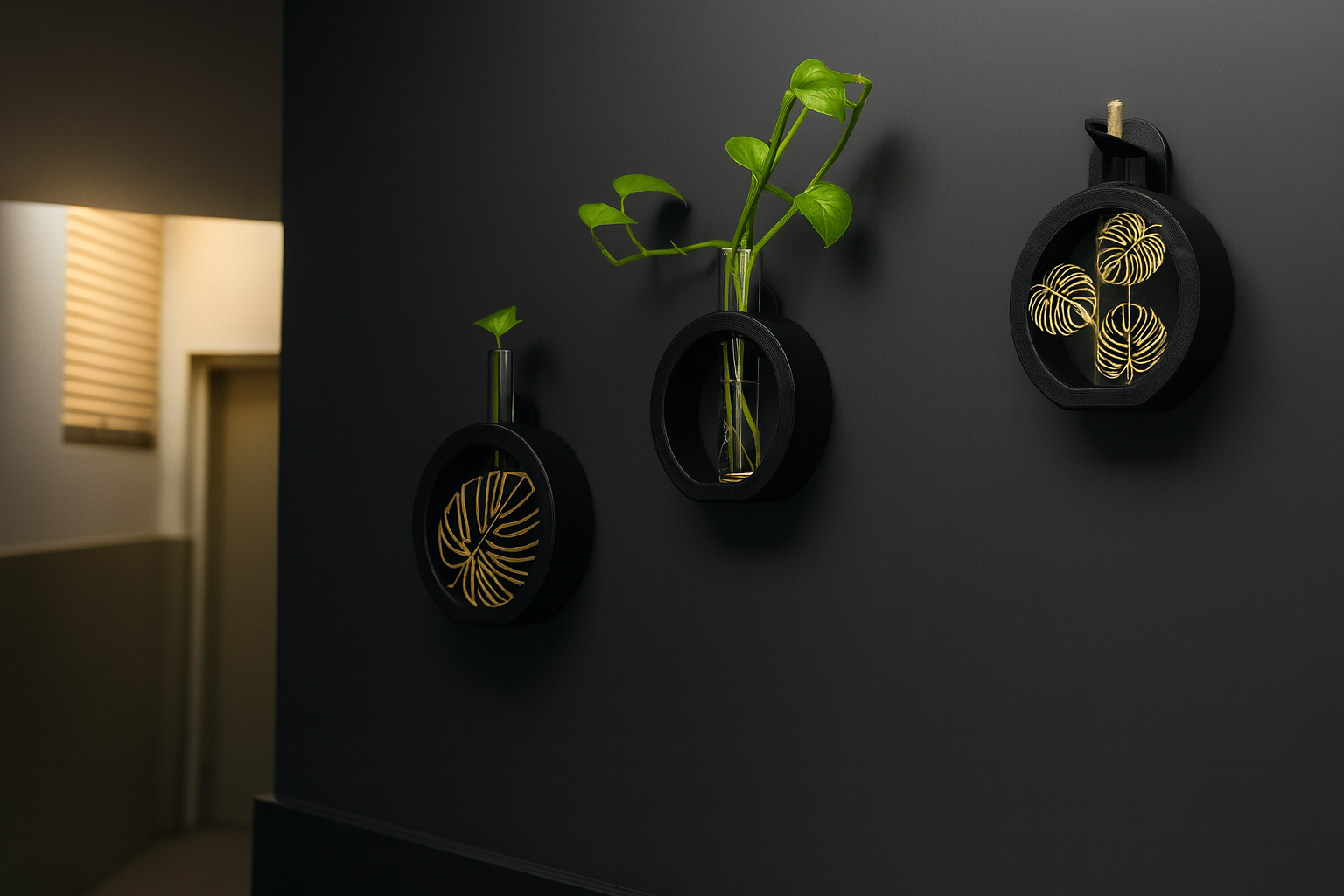 סט 3 מעמדים לייחורים בעיצוב עלים מודרני אלגנטי בצבע שחור זהב – דקורציה חיה ונושמת